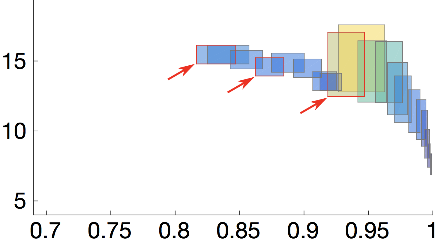 The resulting Pareto front consists of quality attribute regions induced by the parametric designs (see picture). The size and shape of these regions provide key insights into the system robustness since they capture the sensitivity of quality attributes to parameter changes (i.e, small regions = robust designs).
